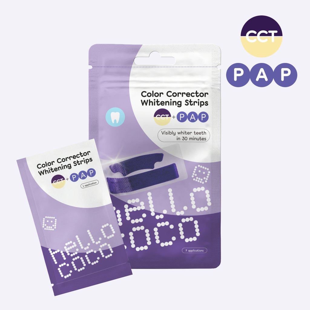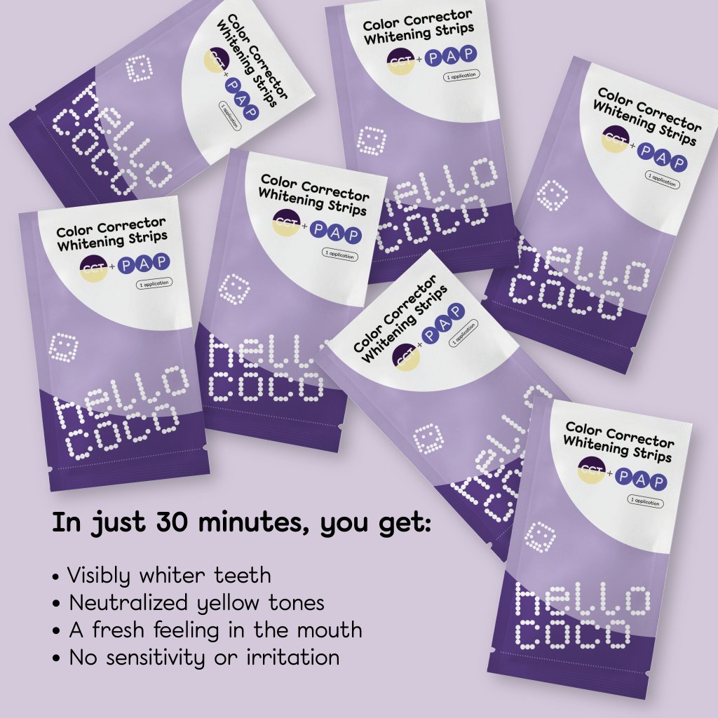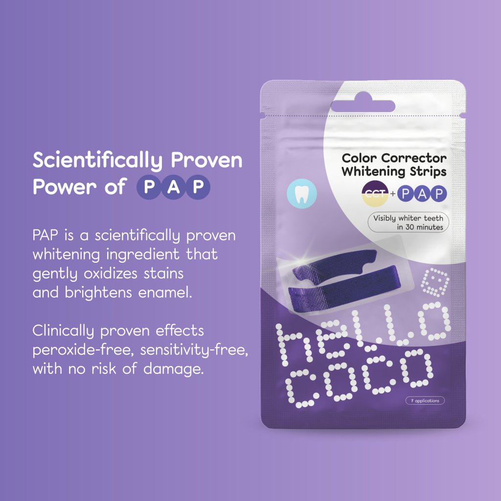 Traditional whitening strips use peroxide-based formulas that can cause tooth sensitivity. hello coco PAP strips instead use a PAP-based formula that whitens without sensitivity.