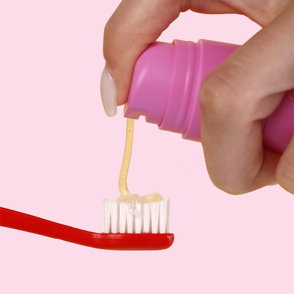 Begin by applying toothpaste to your toothbrush. Brush for at least 2 minutes — and then there’s one more step!